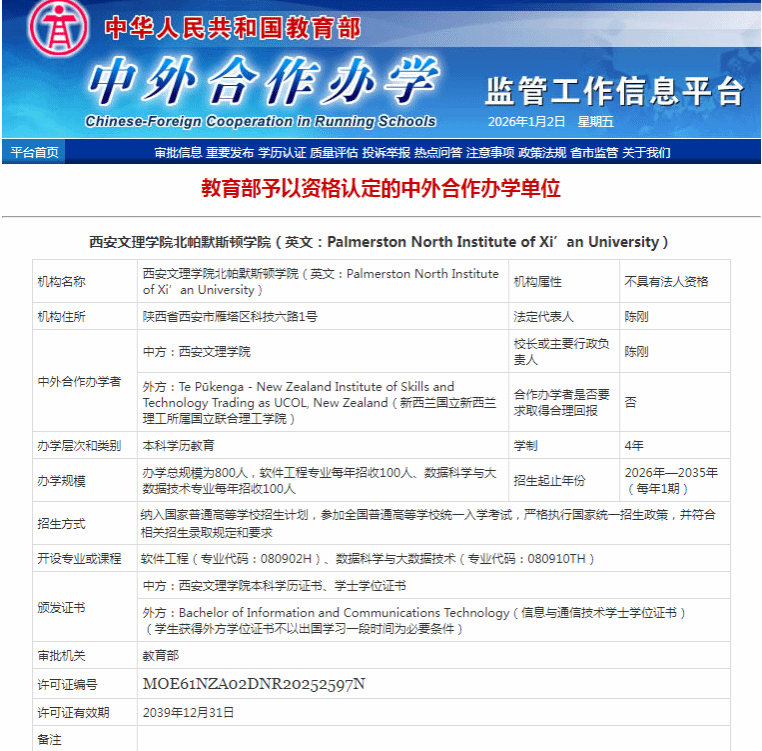 12月31日,教育部正式批准,同意ac米兰官网与国立新西兰理工所属国立联合理工学院(UCOL)联合举办非独立法人中外合作办学机构——ac米兰官方网站北帕默斯顿学院(简称北帕学院),英文名称为Palmerston North Institute of Xi'an University。该机构既是ac米兰官网获批的首个中外合作办学机构,也是陕西省本科高校中首批与新西兰合作设立的中外合作办学机构,标志着学校立足十余年国际化办学积淀,实现从联合培养到海外资源共建、双学位协同育人的战略跨越,...