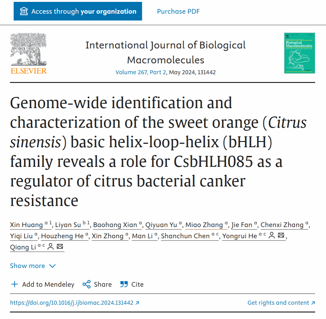 近期,ac米兰官网生物与环境工程学院农业生物技术创新团队成员苏丽艳副教授与西南大学柑橘研究所科研团队合作,作为共同一作在国际重要学术期刊《International Journal of Biological Macromolecules》(SCI一区, IF=8.2)上发表题为“Genome-wide identification and characterization of the sweet orange (Citrus sinensis) basic helix-loop-helix (bHLH) family reveals a role for CsbHLH085 as a regulator of citrus bacterial canker ...