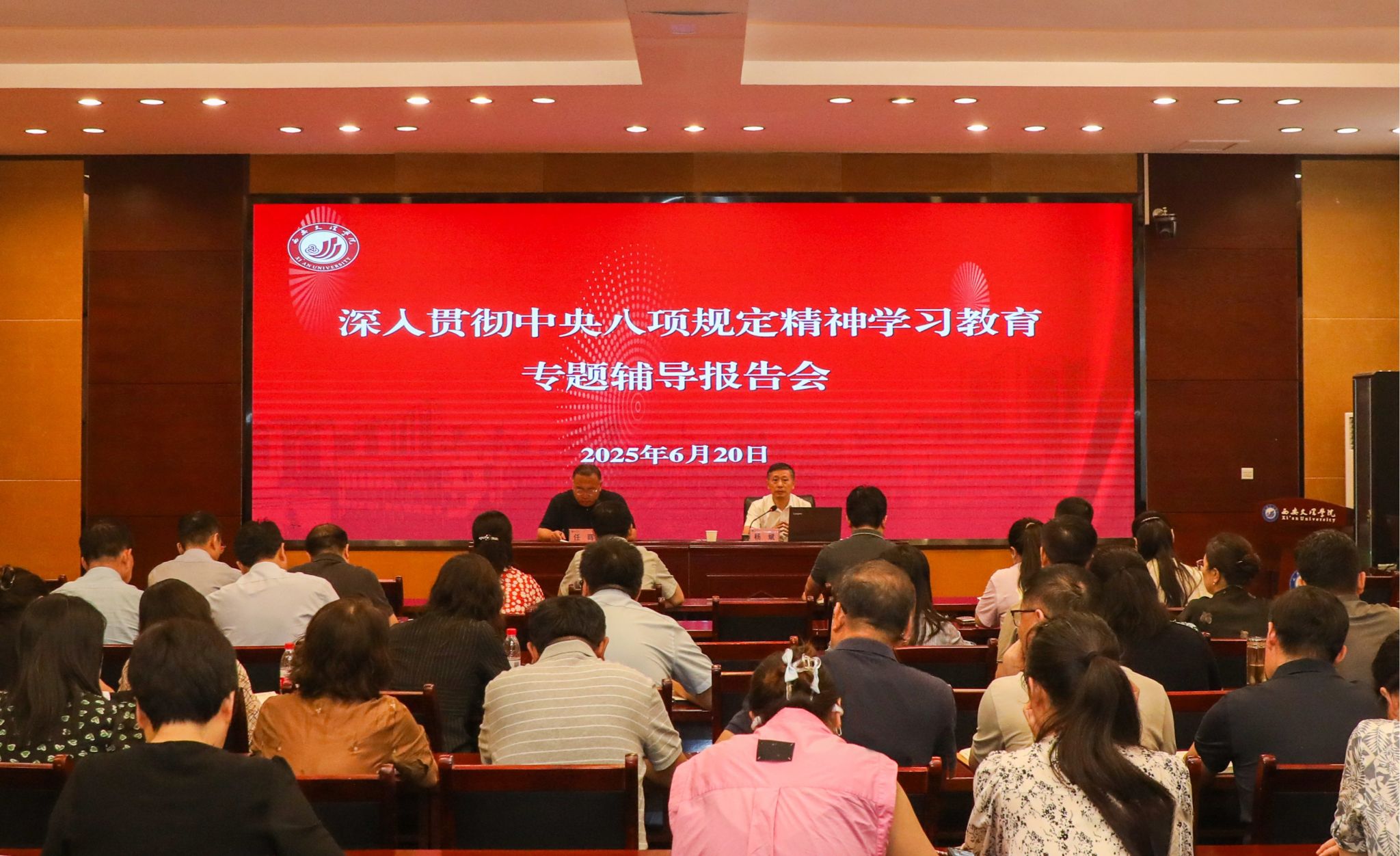 为持续推动深入贯彻中央八项规定精神学习教育走深走实,6月20日上午,学校在办公楼一楼会议室举办深入贯彻中央八项规定精神学习教育专题辅导报告会。西安市委理论讲师团团长杨斌作报告,党委副书记、副校长任晖主持报告会。杨斌以《落实深入贯彻中央八项规定精神学习教育 扎实推进党的作风建设常态化长效化》为题,围绕“从严治党的历史沿革和‘八项规定’的提出”“中央八项规定精神的主要内容”“反腐新形势与作风建设的新任务”“...