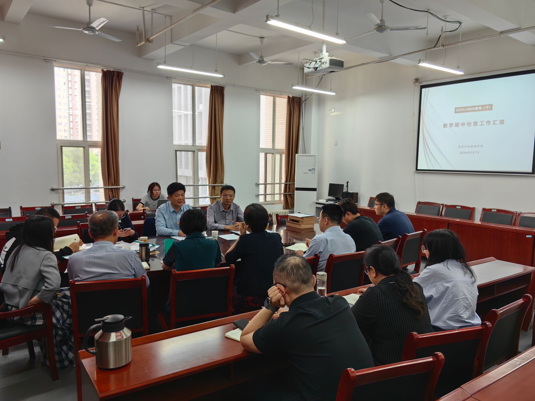 5月7日至5月11日为第二阶段,由学校检查组进行现场检查与反馈。首先,各学院介绍了本学期教学管理工作的总体情况,对学院亟待解决的教学管理问题进行了分析与探讨。随后检查组对各学院提供的教师教学材料进行逐一检查,就发现的问题对学院进行反馈并提出了改进建议,要求各学院对存在的问题进行整改,并做为下次期中教学检查的检查重点。