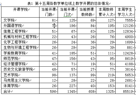 本学期全校教学计划安排947门课程,截止6月7日已开展线上教学的课程有826门(1687门次),占全部课程门数的87.22%,已有230门(342门次)课程已结课或理论部分已结课。第十五周授课教师608人,累计授课1325人次,开设线上课程1404班次。第十五周各教学单位线上教学开展的总体情况如表1所示。