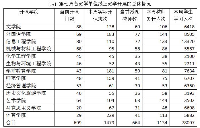 本学期全校教学计划安排947门课程,截止4月12日已开展线上教学的课程有706门(1518门次),占全部课程门数的74.6%,已有7门(40门次)课程已结课或理论部分已结课。第七周授课教师累计1134人次,开设线上课程1257班次。第七周各教学单位线上教学开展的总体情况如表1所示。