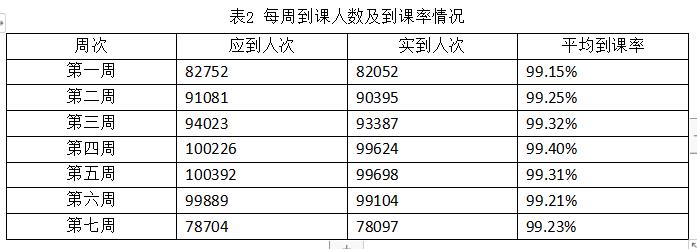 根据课程安排,应参加在线学习的学生9629人,其中第七周应参加在线学习的学生78704人次,实际上课人数78097人次,平均到课率为99.23%。每周到课人数及到课率情况如表2所示。