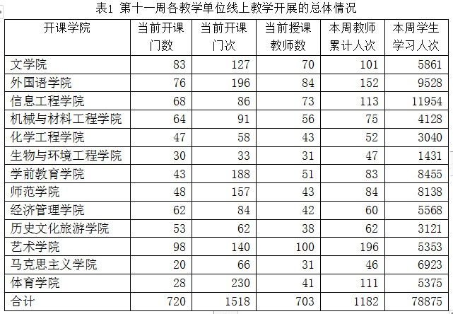 本学期全校教学计划安排947门课程,截止5月10日已开展线上教学的课程有815门(1671门次),占全部课程门数的86.06%,已有95门(153门次)课程已结课或理论部分已结课。第十一周授课教师703人,累计授课1182人次,开设线上课程1284班次。第十一周各教学单位线上教学开展的总体情况如表1所示。