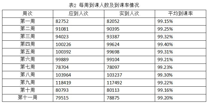 根据课程安排,应参加在线学习的学生9629人,其中第十一周应参加在线学习的学生79515人次,实际上课人数78875人次,平均到课率为99.20%。每周到课人数及到课率情况如表2所示。