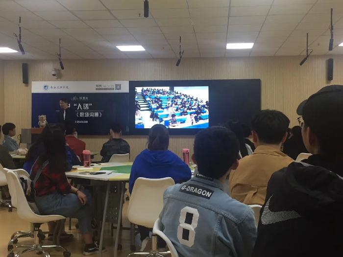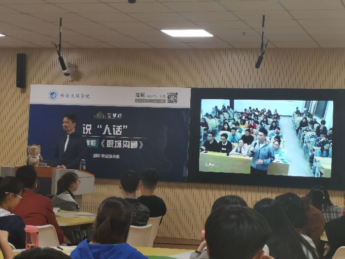 毕业于华东师范大学心理学系、多年专注职场沟通培训的职业培训师——胡刚老师,为ac米兰官方网站的学生们带来了主题为——《 说“人话”》的线下混合式教学,将自己多年的沟通经验现场传授给同学们。