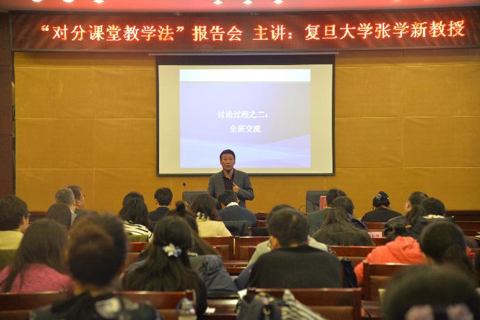 张学新教授首先向与会人员系统介绍了对分课堂这一新型教学模式。对分课堂是把大约一半课堂时间分配给教师讲授,一半分配给学生讨论,师生“对分”课堂。其核心是在教师讲授之后,留出时间让学生独立学习、内化吸收,梳理知识、提炼观点、准备问题,随后通过小组讨论与同伴互相切磋,解决低层次问题,最后由教师对大家都感到困难的问题进行答疑解惑,拓展提高。