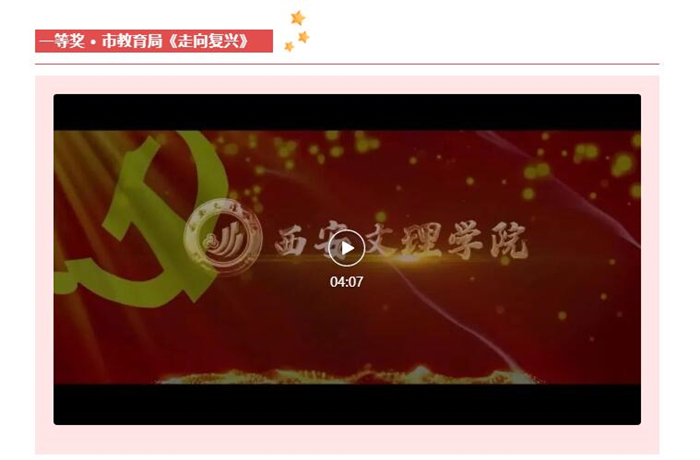 近日,市直机关工委 “弘扬秦人精神、砥砺奋进征程、共迎伟大盛会”短视频大赛结果揭晓。ac米兰官网党委宣传部、音乐学院联合制作的视频作品《走向复兴》荣获一等奖。
