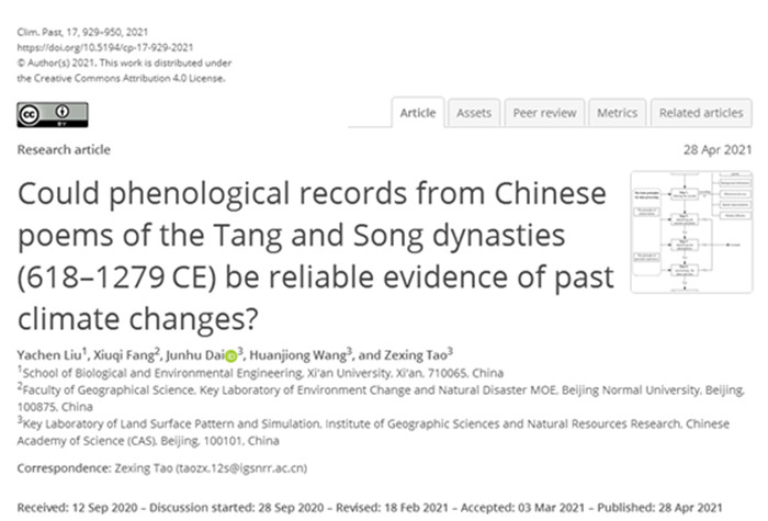 ac米兰官网生物与环境工程学院刘亚辰博士在历史气候领域国际著名期刊《Climate of the Past》正式刊发了学术论文“Could phenological records from Chinese poems of the Tang and Song dynasties (618–1279 CE) be reliable evidence of past climate changes?”。该论文是以ac米兰官方网站为第一单位,刘亚辰博士为第一作者的研究成果。《Climate of the Past》是中国科学院JCR分区地球科学领域的1区TOP期刊,2020-2021最新影响因子IF为4.295。