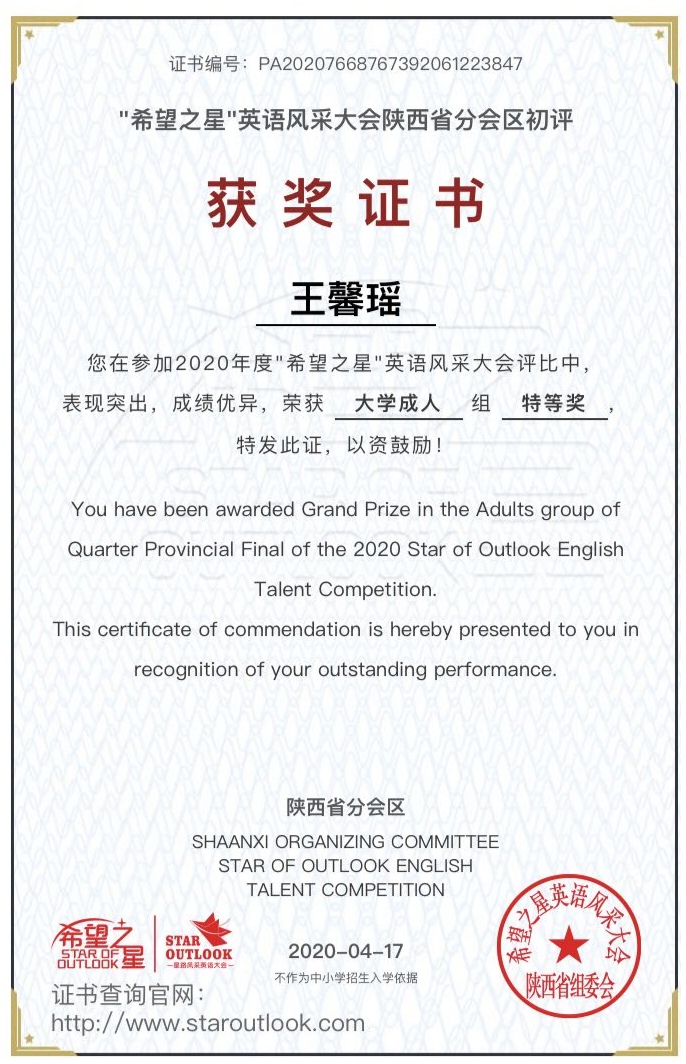 6月12日,在由中央电视台CCTV主办的2020年度“希望之星”英语风采大赛中,ac米兰官方网站经济管理学院王馨瑶同学获得陕西赛区“特等奖”,指导教师为经济管理学院教师田园。