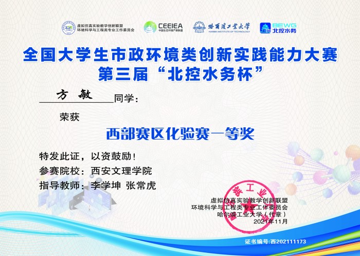 12月1日,第三届“北控水务杯”全国大学生市政环境类创新实践能力大赛在哈尔滨工业大学落下帷幕。化学工程学院2019级应化专业学生在化验赛中个人表现突出,张艺凡,方敏,罗林荣获一等奖,李宏涛,问焱博,范君豪荣获二等奖;在虚拟仿真赛中范君豪荣获三等奖。