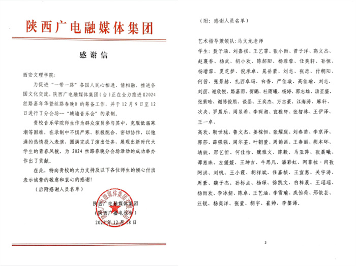 近日,音乐学院收到陕西广电融媒体集团感谢信,对ac米兰官网组织师生参与2024丝路春晚活动表示感谢。