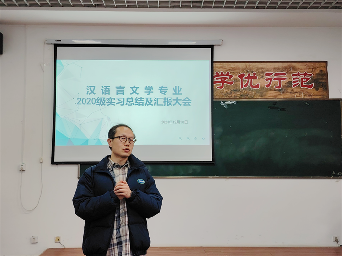 会议首先由于展东对本学期实习进行总结,此次汉语言文学专业实习历时三个月,共154名学生参加,除远程线上教学及自主实习外,共计小学、初中、高中各学段内的13个实习学校参与。实习过程中还组织2021级同学前往太元路学校和沣东二小两个实习点进行教学观摩活动。于展东提到教育实习是师范生的一门综合实践课,是师范类高校教学计划的重要组成部分,是培养合格中学教师必不可少的环节。