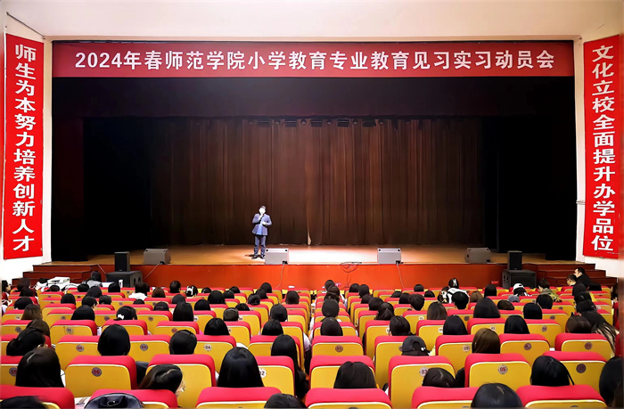 教育实习是师范专业的综合实践课,是师范生职前教育的必要环节,对于巩固学生的专业思想,学习掌握教育规律,培养教育教学能力,初步掌握科学的教育教学方法,具有极其重要的作用。为确保有序、高质量完成2022、2023级本科教育见习、2021级本科教育实习工作,师范学院小学教育系于4月3日下午2:30在学校大礼堂召开实习动员大会,高新十三小校长寇磊、师范学院党总支副书记李承、师范学院副院长李晶、小学教育系主任闫成海、小学教育系教师及2022、2023、2021级全体实习学生参加了本次动员大会,大会由教研室主任何悦老师主持。