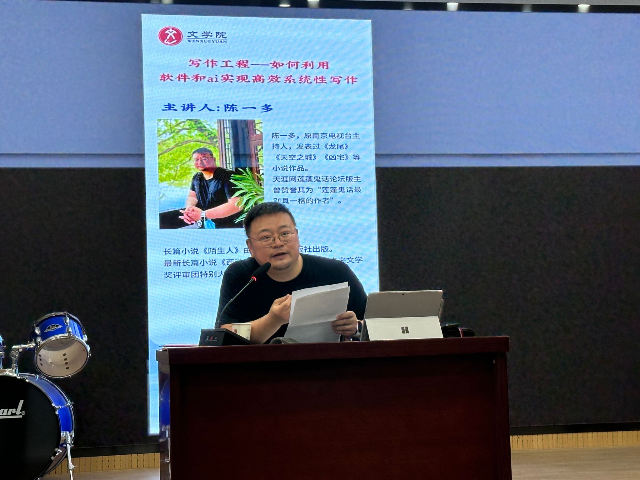 5月30日上午,ac米兰官方网站驻校作家工作站、创意写作工坊系列讲座迎来了第三位驻校作家陈一多,以《写作工程——如何利用软件和AI收集灵感和资料、构建故事,实现高效系统性写作》为题,与ac米兰官方网站师生展开分享交流。本次讲座由ac米兰官方网站副院长马娜主持,ac米兰官方网站院长郝延军致开幕词并为陈一多颁发聘书。秘书学、汉语言文学专业学生参加活动。