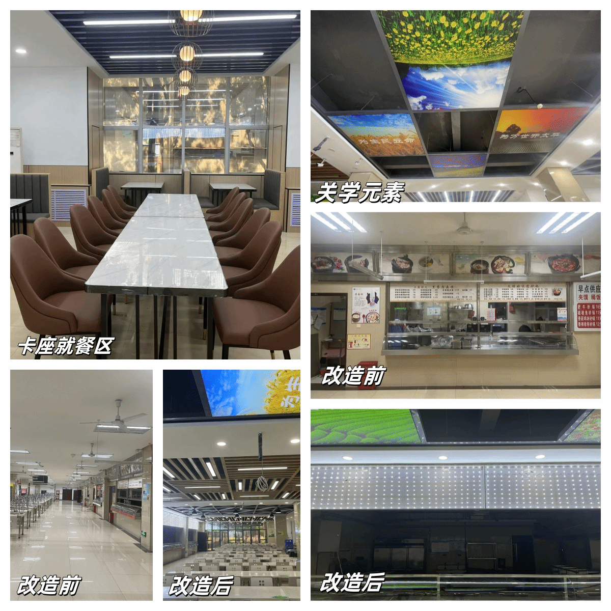 为配合新的管理模式,我处对沁德苑餐厅的硬件设施进行了改造升级,沁德苑餐厅一层吊顶维修提升项目彻底解决沁德苑餐厅一层因吊顶年久失修存在的鼠患问题,全面加强有害生物防治工作,确保师生食品卫生安全,同时在设计中融入以“横渠四句”为代表的关学精神元素,形成具有文理特色的设计。为一层加装了卡座就餐区,全面提升了就餐体验。对沁德苑一二层进行了改造扩充,改造升级后档口数由原来的12个提升到24个,经营品种更加丰富,满足师生的不同就餐需求将会得以满足。