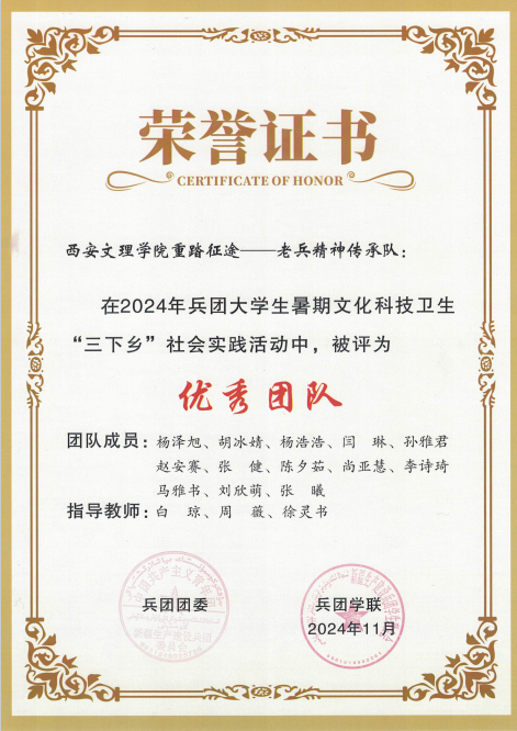 近日,ac米兰官网重踏征途——老兵精神传承队在2024年全国大学生暑期文化科技卫生“三下乡”社会实践活动兵团专项活动中获评“优秀团队”称号。