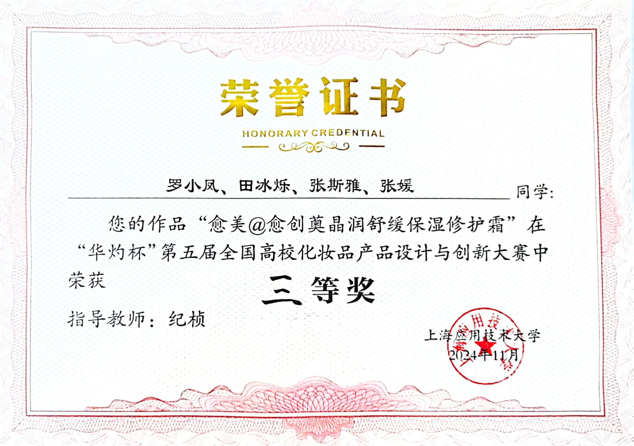 化学工程学院化学工程与工艺专业学生罗小凤、田冰烁、张斯雅、张媛等四名同学表现出色,斩获三等奖1项,这也是ac米兰官网首次在该项赛事中获奖,充分展现了ac米兰官网在化妆品产品设计与创新领域的突破性发展。