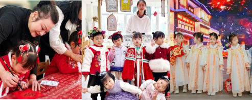 元旦节庆乐融融,非遗古韵永流芳。此次庆祝活动以传统文化为主题,每个班级一个主题内容,大家做簪花缝云肩、写福字绘蜡染,制作传统美食、创作非遗作品,同玩趣味游戏。学院领导、老师同幼儿一起游戏,气氛热烈而温馨。师生都在亲身体验中感受到了传统节日的丰富文化内涵,笑声交织,欢乐飞扬。由学院江露露博士编排、2021级实习生参与的歌伴舞表演《呦呦鹿鸣》,以艺术化的形式展现了《诗经》中宴乐宾客的欢乐场景。