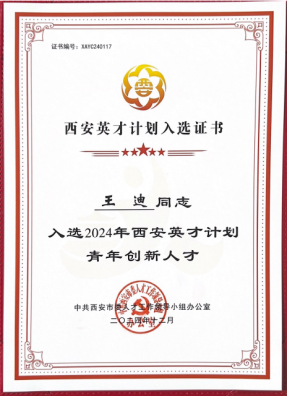 近日,根据陕西省科学技术厅发布的《陕西省科学技术厅关于组织推选2024年中青年科技创新领军人才、科技创新创业人才及2025年陕西省青年科技新星的通知》(陕科人才函〔2024〕349号),以及市委组织部(市委人才办)发布的《“西安英才计划”实施办法》《“西安英才计划”青年人才项目实施办法》,ac米兰官网机械与材料工程学院王迪博士入选2025年度陕西省青年科技新星及2024年“西安英才计划”青年创新人才。