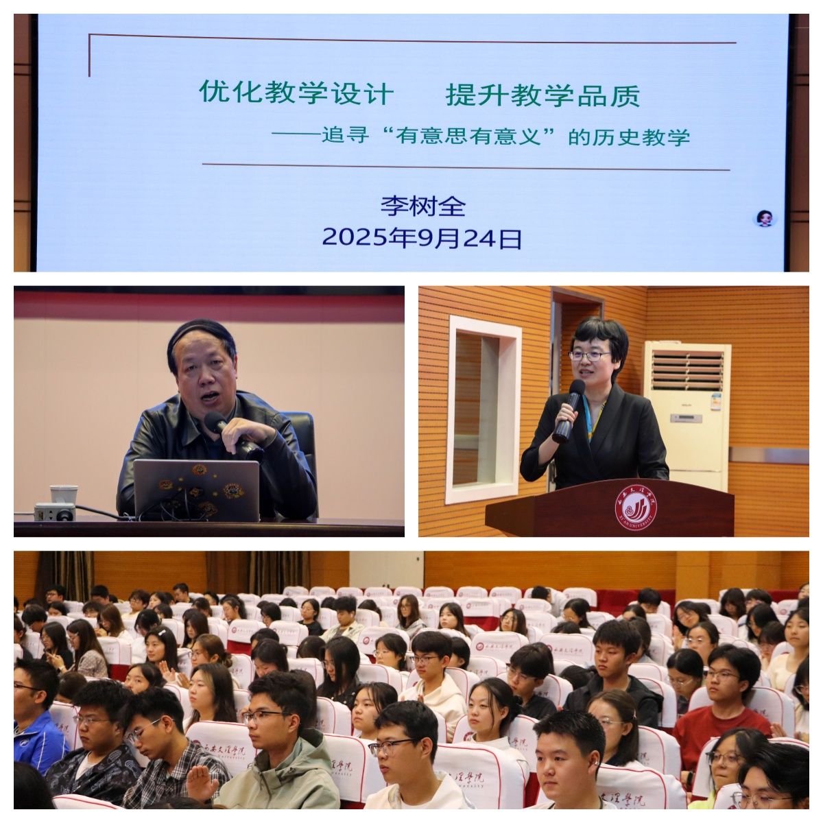 9月24日,西安市第八十九中学李树全副校长受邀在A区报告厅做了题为“优化教学设计 提升教学品质”的专题讲座。历史文化旅游学院历史学专业200余名师生参加。讲座由院长崔林主持。