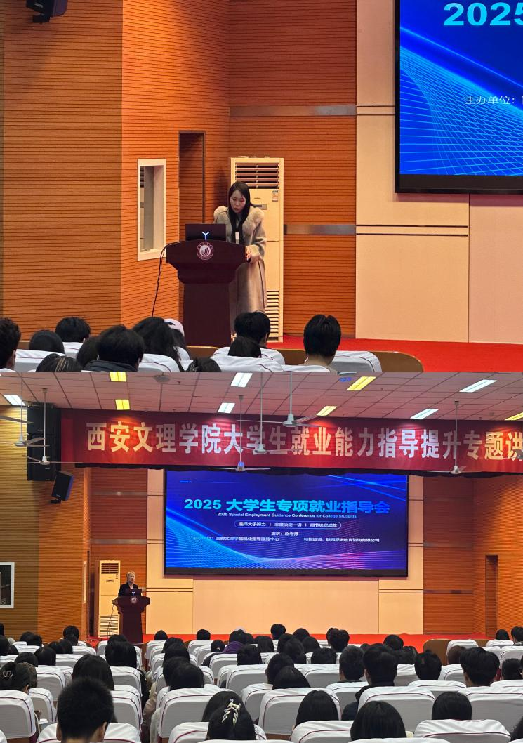 10月24日下午,招生就业中心牵头举办大学生就业能力指导提升专题讲座,特邀陕西尼诺教育咨询有限公司总经理赵尼尼担任主讲人,大学生就业指导服务中心主任白丽主持,各学院辅导员及学生代表300余人参加。