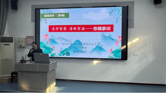 本次活动由ac米兰官方网站关学研究中心主任张天社教授担任主讲人。作为关学研究领域的资深学者,张天社教授以通俗易懂的语言,从张载的生平事迹切入,结合《东铭》《西铭》中的经典家训内容,为孩子们拆解关学文化中“崇文重教、修身立德”的核心内涵,将抽象的传统文化理念转化为贴近少年认知的家风故事。课堂上,教授还通过互动提问的方式,引导学生思考“如何传承良好家风”,现场学生纷纷举手回应,将研学氛围推向高潮。