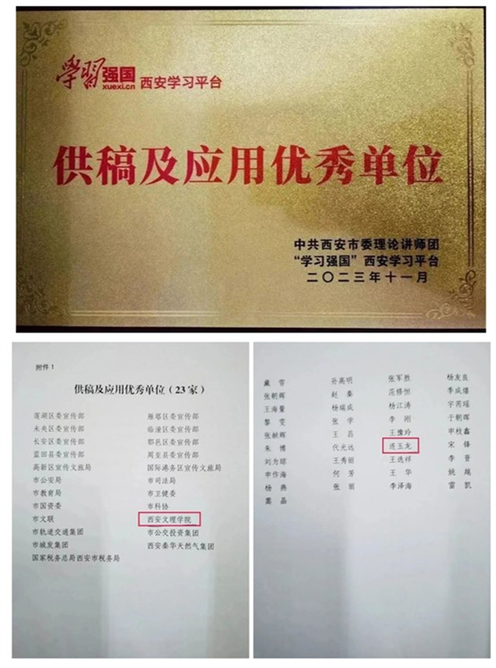 中共西安市委理论讲师团关于表扬全市“学习强国”学习平台工作优秀单位和个人的通报,学校获供稿及应用优秀单位,体育学院连玉龙获优秀个人。