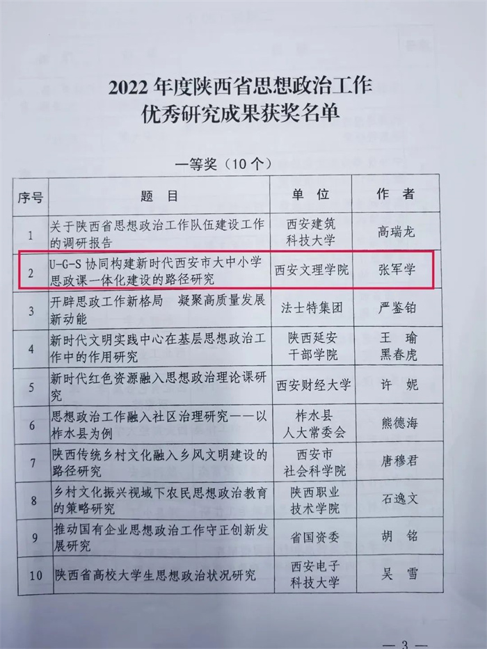 中共陕西省委宣传部(陕宣字〔2023〕115 号),经济管理学院党总支组织员张军学教授主持的《U-G-S协同构建新时代西安市大中小学思政课一体化建设的路径研究》获陕西省思想政治工作优秀研究成果一等奖。