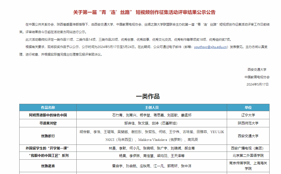 近日,首届“青‘连’丝路”短视频创作征集活动获奖公示结束。由西安广播电视台(集团)选送、ac米兰官网师生参与,在ac米兰官网关中书院全程拍摄的视频短片《外国留学生的‘开学第一课’》获“一类作品”和“优秀创意奖”两项大奖。