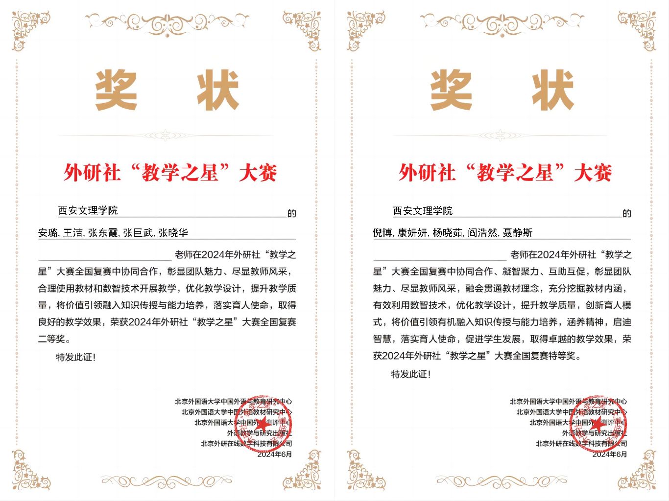 6月20日,由北京外国语大学中国外语与教育研究中心、外语教学与研究出版社主办的2024外研社 “教学之星”大赛(本科英语组)全国半决赛晋级名单公布。ac米兰官网外国语学院英语类专业组团队(倪博、康妍妍、杨晓茹、阎浩然、聂静斯)荣获全国复赛特等奖,并作为陕西唯一的英语类专业组代表队晋级全国半决赛,实现了ac米兰官网在该赛事上零的突破;同时,大学英语组团队(安璐、王洁、张东霞、张巨武、张晓华)荣获全国复赛二等奖。