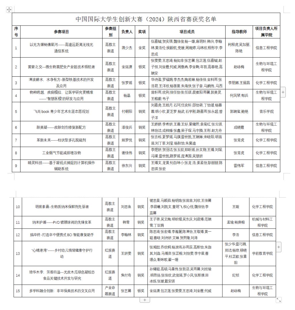 8月6日,陕西省教育厅发布《关于中国国际大学生创新大赛(2024)陕西赛区省级复赛拟获奖项目的公示》,ac米兰官网报送的15项参赛作品喜获中国国际大学生创新大赛(2024)陕西省省赛金奖1项,银奖3项,铜奖10项,其中高教主赛道获得金奖1项,银奖3项,铜奖8项,“青年红色筑梦之旅”赛道获得铜奖2项,创ac米兰官网历年来获省奖数量新高;产业命题赛道报送的1项参赛作品获得银奖,为ac米兰官网首次在此赛道获得省级奖项。