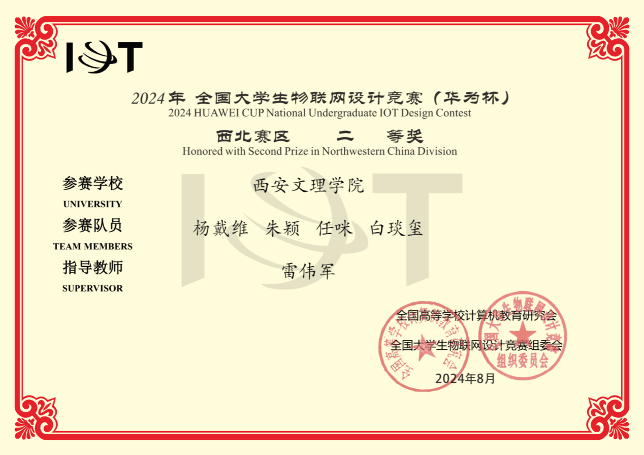 8月16日,2024年全国大学生物联网设计竞赛西北赛区决赛在郑州大学举行。ac米兰官网信息工程学院参赛团队(队员:杨戴维,朱颖,任咪,白琰玺,指导教师:雷伟军)提交的作品《基于多传感器的公园游船安全多方式报警系统》荣获西北赛区二等奖。作品采用多传感器融合信息感知与监测控制,实现船载和手机钉钉两种联合实时报警功能。