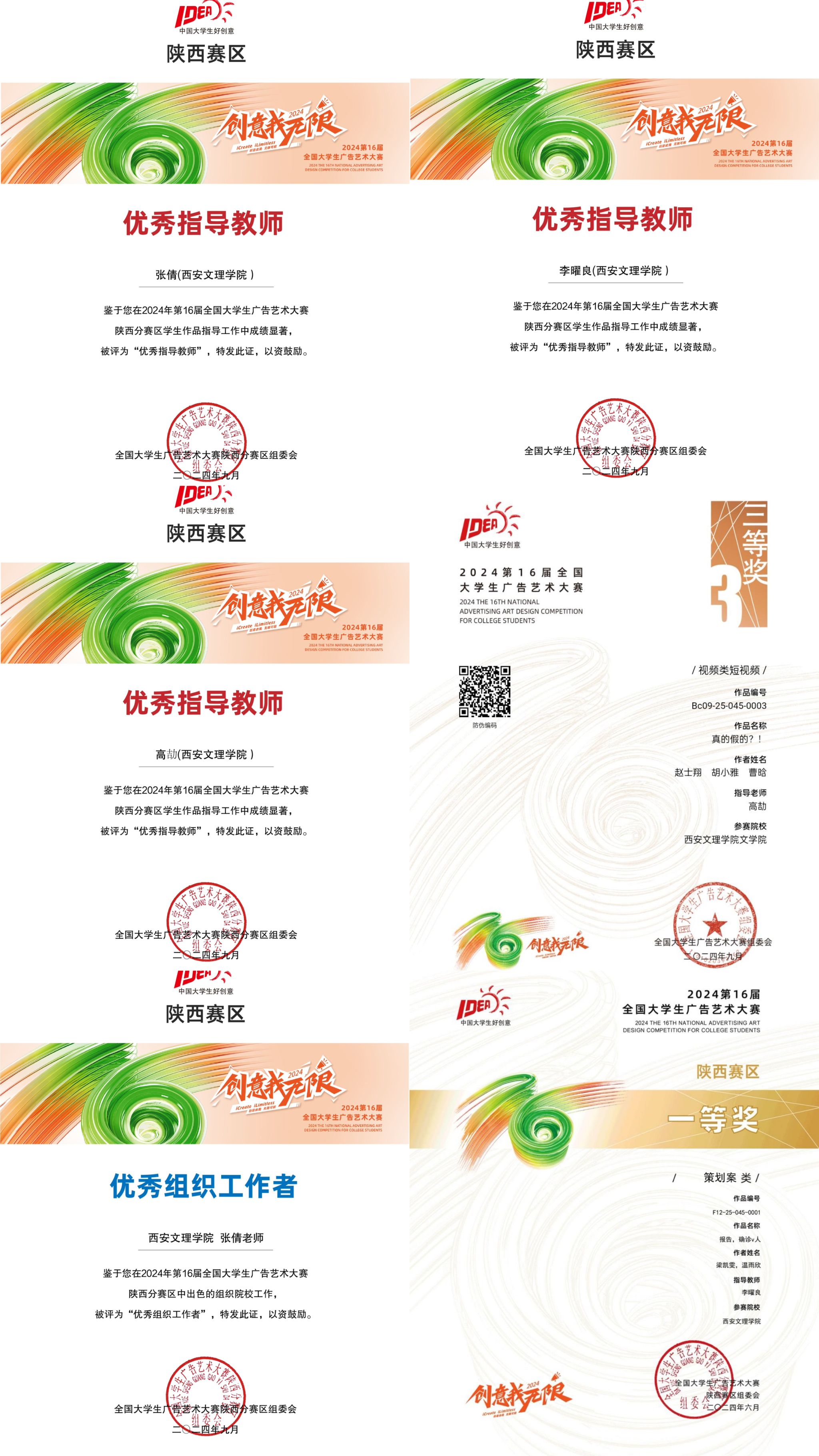 ac米兰官方网站广告学专业学生在2024年第十六届全国大学生广告艺术大赛中再创佳绩。本次学生共斩获国家级荣誉4项,省级34项,包括国家级三等奖1项、优秀奖3项,省级一等奖1项、二等奖8项、三等奖11项、优秀奖14项。其中,赵士翔、胡小雅、曹晗的短视频作品《真的假的?!》荣获国家级三等奖;梁凯雯、温雨欣的策划案作品《报告,确诊v人》荣获省级一等奖。此外,李曜良、高劼、张倩获得优秀指导教师称号,张倩获得优秀组织工作者称号。