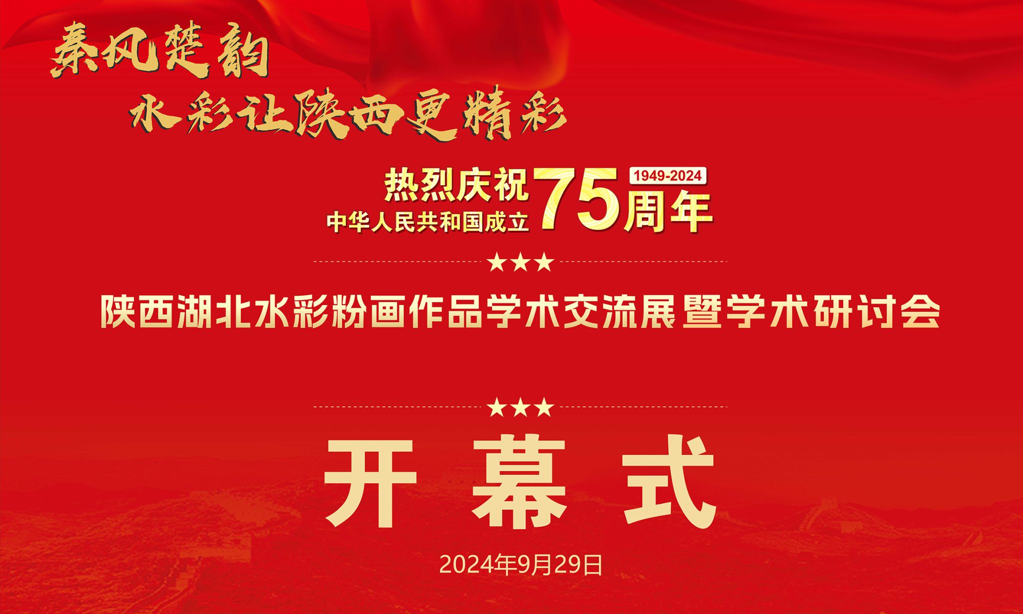 9月29日下午,庆祝中华人民共和国成立75周年——“秦风楚韵”陕西湖北水彩粉画作品学术交流展在ac米兰官网开幕,来自湖北、陕西、浙江、山东、福建、云南等地的两百余位艺术家参加开幕式。在这个特殊时刻,艺术家们用一幅幅精彩的作品表达着对伟大祖国的热爱和祝愿,与全国人民一起共庆祖国的生日,祝福祖国更加繁荣昌盛!