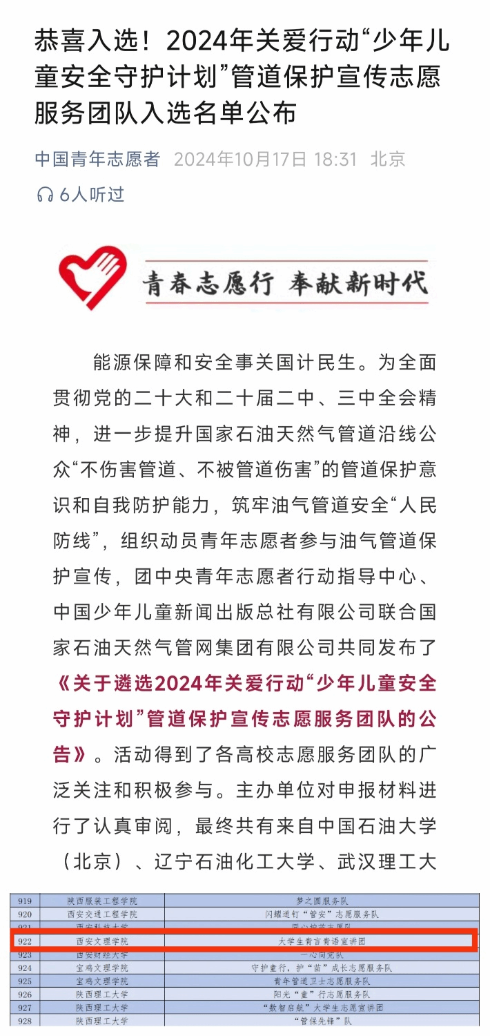 近日,团中央青年志愿者行动指导中心、中国少年儿童新闻出版总社有限公司联合国家石油天然气管网集团有限公司共同发布《关于遴选2024年关爱行动“少年儿童安全守护计划”管道保护宣传志愿服务团队的公告》,ac米兰官网机械与材料工程学院大学生青言青语宣讲团成功入选为全国高校1000支志愿服务团队!