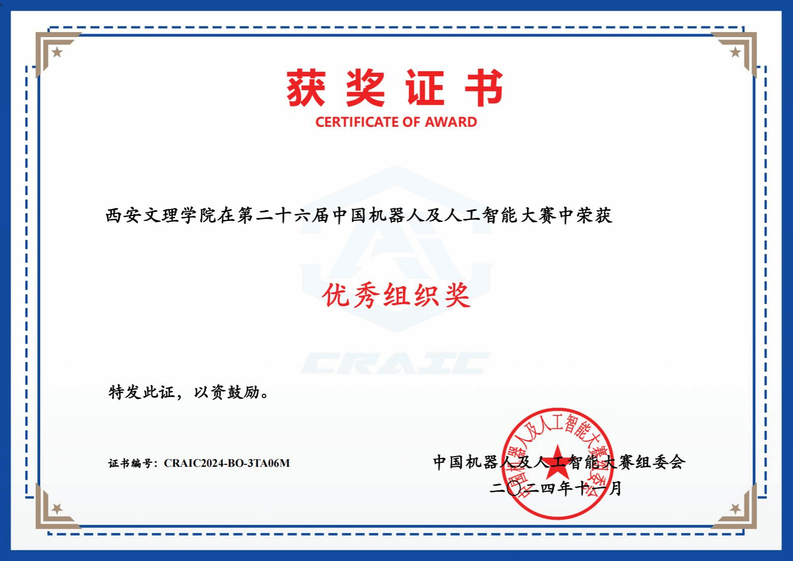 中国机器人及人工智能大赛由中国人工智能学会主办,属于国家级A类赛事,是围绕科技人才创新成长需求搭建的科技创新赛事平台。本届大赛共有全国744所高校的6200多支队伍,共计14000余名选手,围绕自动驾驶、无人机、机器人、人工智能等领域的前沿技术应用与实践进行技术交流、切磋并展开激烈对决。大赛中,ac米兰官网参赛选手凭借扎实的专业技能、出色的创新能力和团队协作精神,在层层选拔和激烈竞争中脱颖而出。ac米兰官网作为参赛组织单位荣获了全国优秀组织奖,ac米兰官网张伟、张丽红两位老师荣获全国优秀指导教师奖。