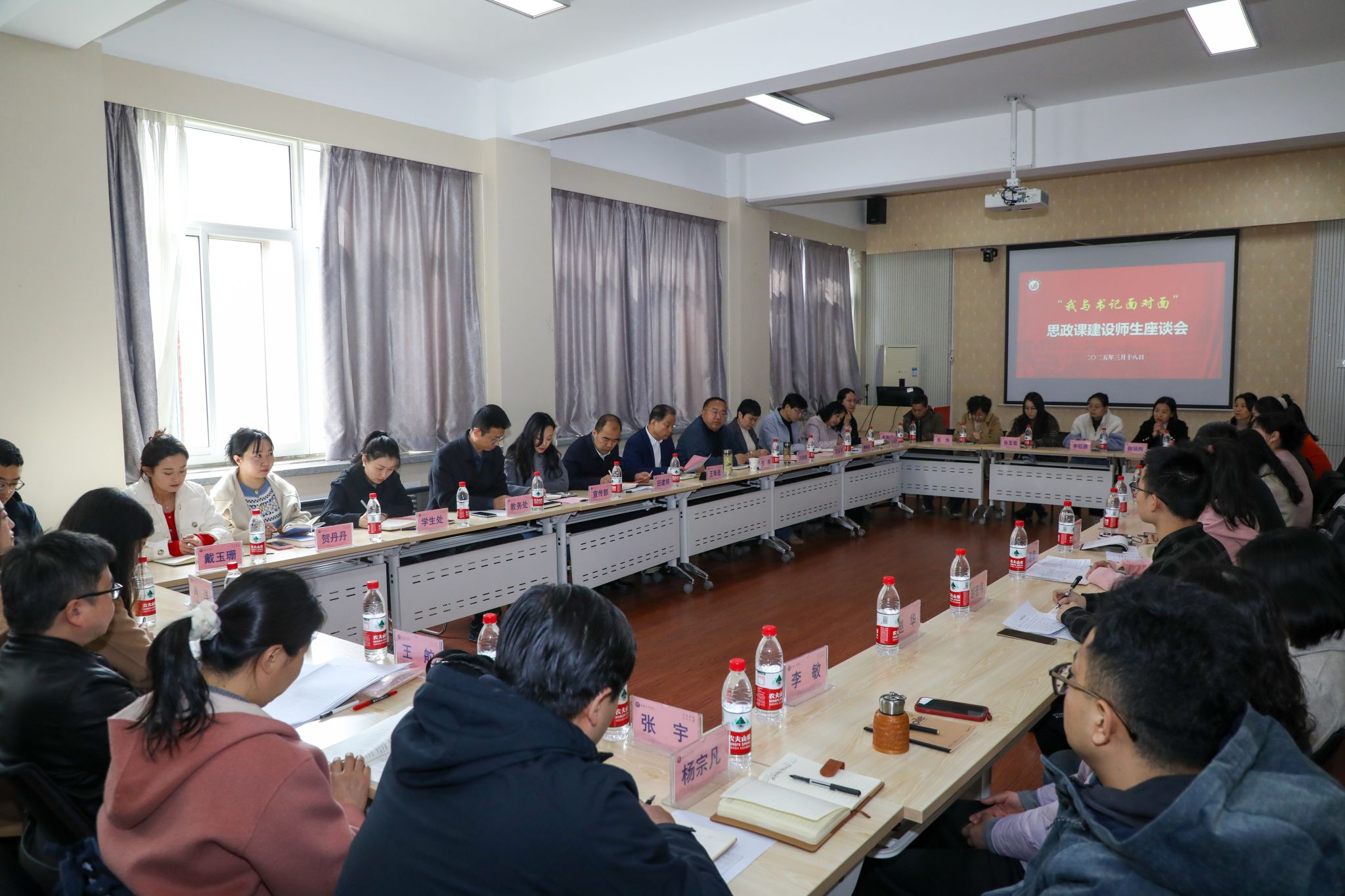3月18日下午,学校召开“我与书记面对面”思政课建设师生座谈会,校党委书记王育选出席并和师生互动交流。校党委委员、副校长任晖主持座谈会。宣传部、教务处、学生处、马克思主义学院负责人;思政课、课程思政教师及学生代表参加座谈会。