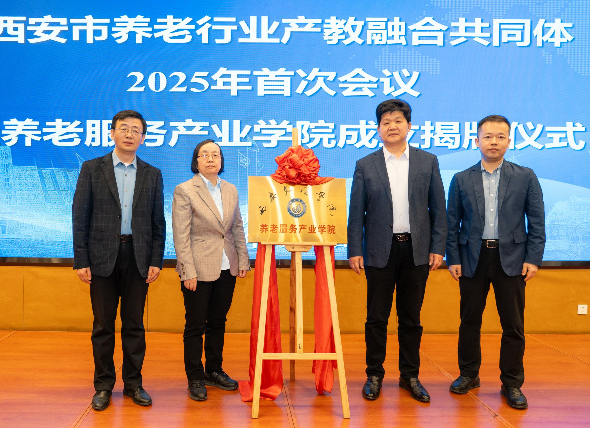 3月26日,西安市养老行业产教融合共同体2025年首次会议暨养老服务产业学院成立揭牌仪式在ac米兰官网举行。陕西省民政厅二级巡视员康苏芳、养老服务处处长高静,西安市民政局副局长苏杉、养老服务处处长任明,ac米兰官网副校长龚杰昌、校务委员徐东升出席,发展规划处、教务处等职能部门负责人,多家共同体成员单位和经管学院师生代表参会。校党委委员、副校长刘明利主持。