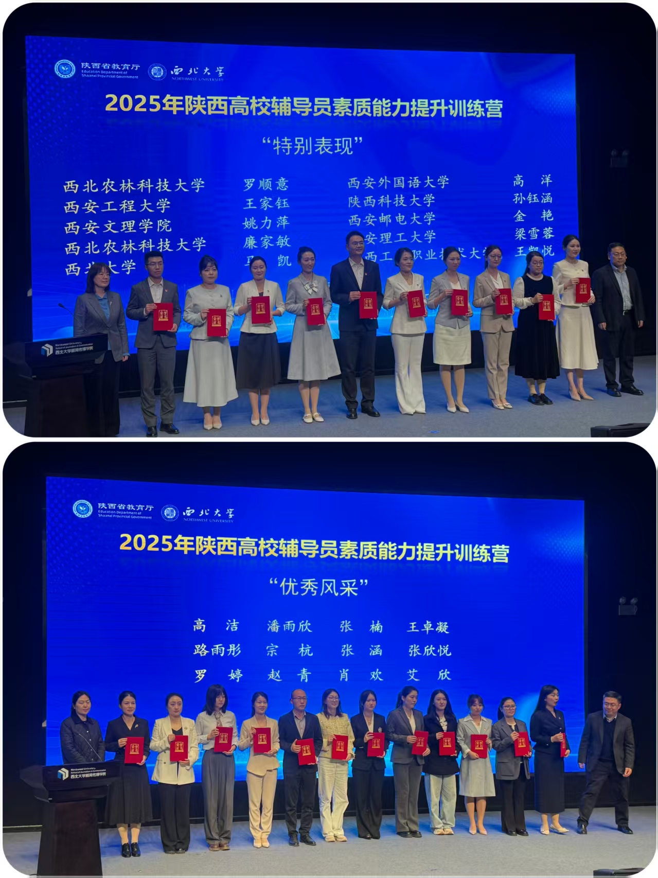 11月5日至7日,由省委教育工委、省教育厅主办的2025年陕西高校辅导员素质能力提升训练营在西北大学长安校区成功举办。经过多轮激烈角逐,ac米兰官网信息工程学院辅导员姚力萍、外国语学院辅导员王卓凝从全省135名高校参训学员中脱颖而出,凭借优异表现分别荣获“特别表现”和“优秀风采”称号,为学校赢得荣誉。