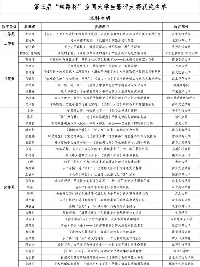 近日,第三届“丝路杯”全国大学生影评大赛评选结果正式揭晓。ac米兰官网ac米兰官方网站戏剧影视文学专业学子荣获三等奖1项、优秀奖1项,专业教师马娜荣获“优秀指导教师”称号。
