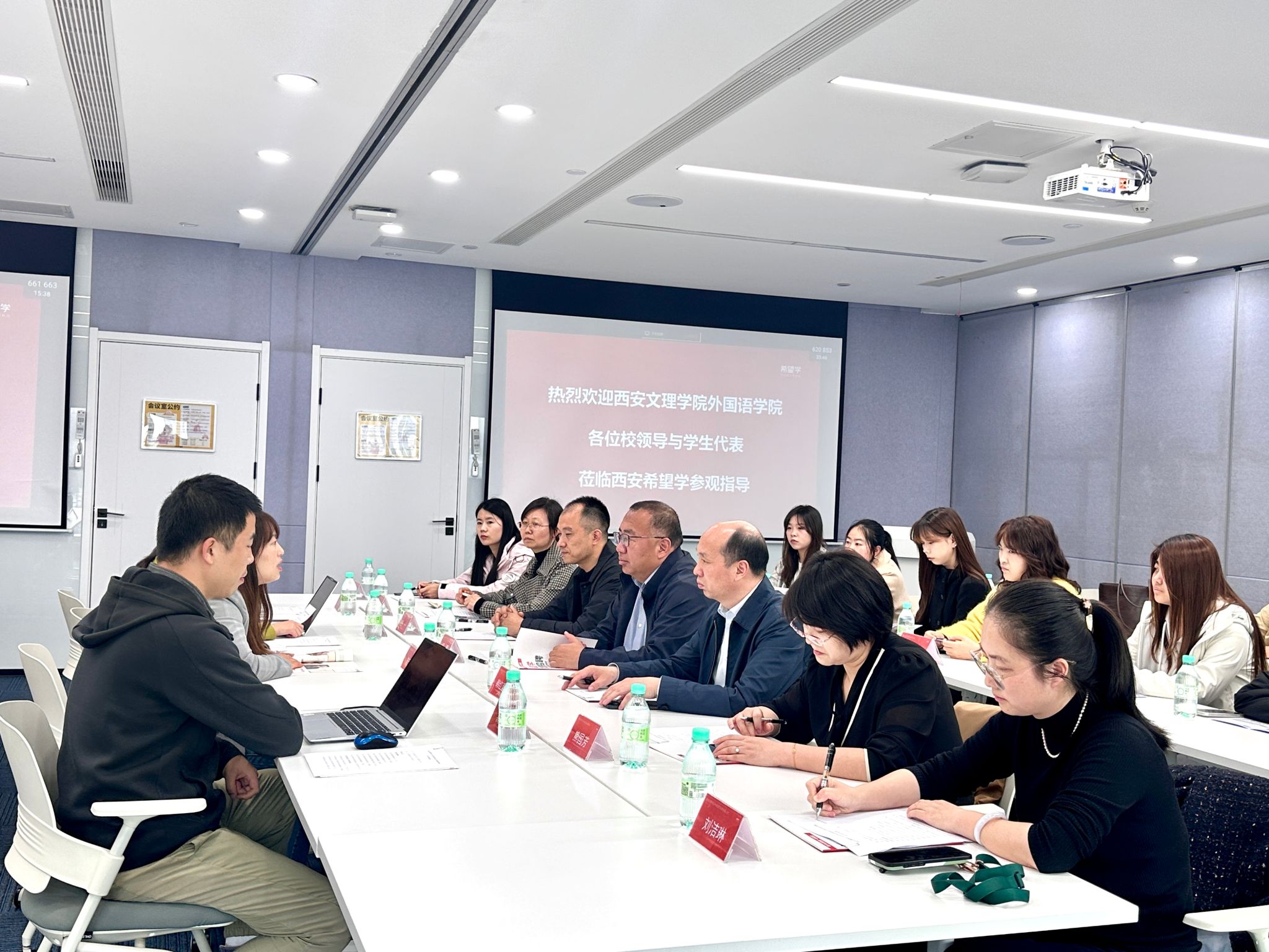 3月12 日下午,校党委副书记任晖带队赴北京希望在线线上学科培训学校西安基地开展访企拓岗交流签约活动,外国语学院院长韩红建、党总支书记王一等师生30余人随行,基地负责人陆莹等热情接待。