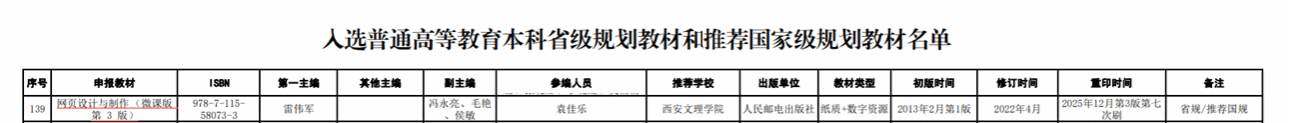 近日,陕西省教育厅公布入选省级规划教材名单,信息工程学院教师撰写的《网页设计与制作微课版第3版》入选陕西省普通高等教育本科规划教材,同时被推荐国家级规划教材。