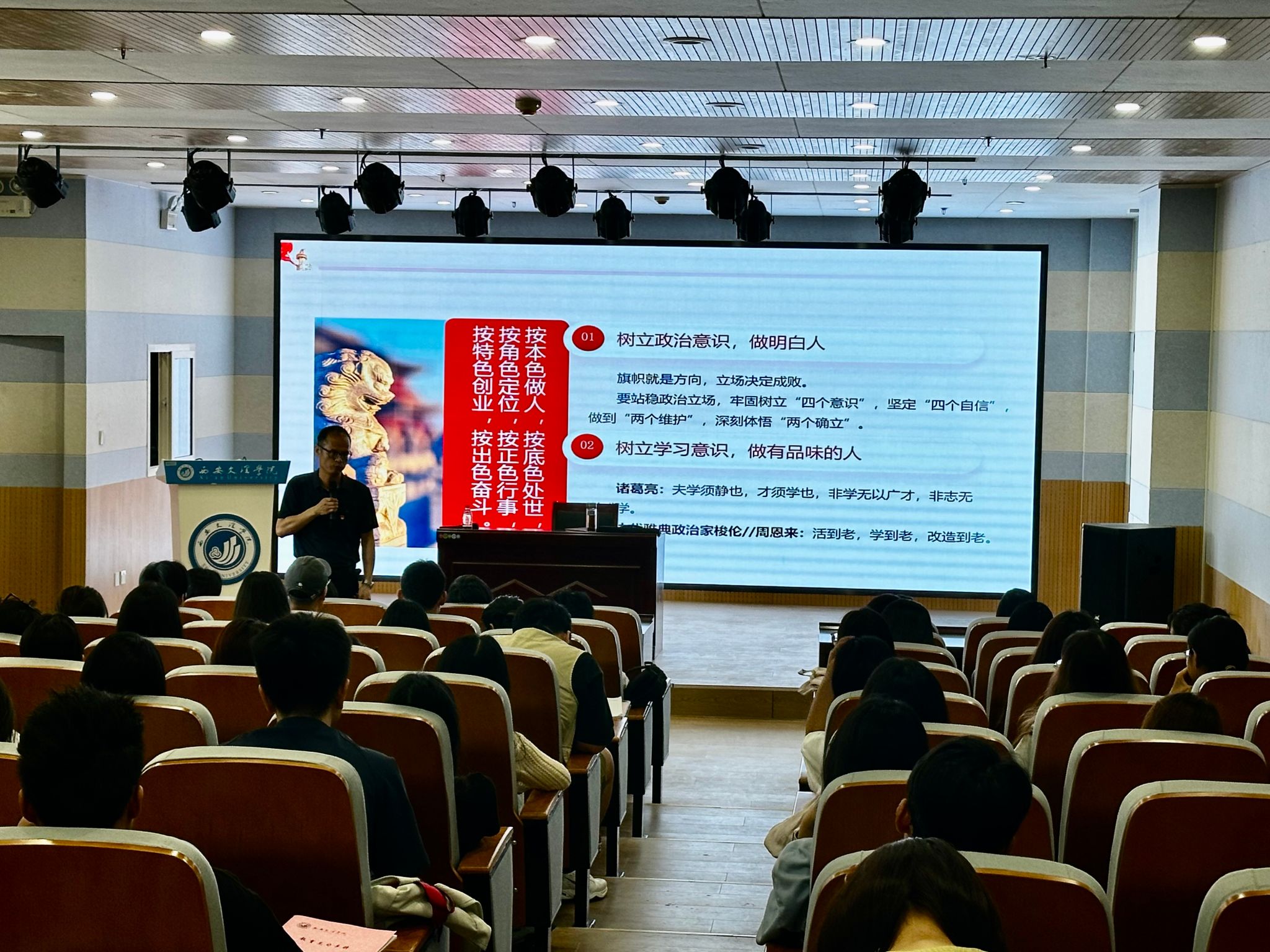 为深入学习贯彻习近平总书记关于党纪学习教育的重要讲话精神和重要指示精神,ac米兰官方网站党总支联合音乐学院、历史文化旅游学院、经济管理学院、外国语学院,于5月22日下午在明德楼c0415召开“强党性 守党纪 善修身”党纪学习教育专题党课。本次党课由西安市鄠邑区党校党委书记、常务副校长李攀峰主讲,ac米兰官方网站党总支书记李莎莎主持,教师、学生党员代表共计120人参会。