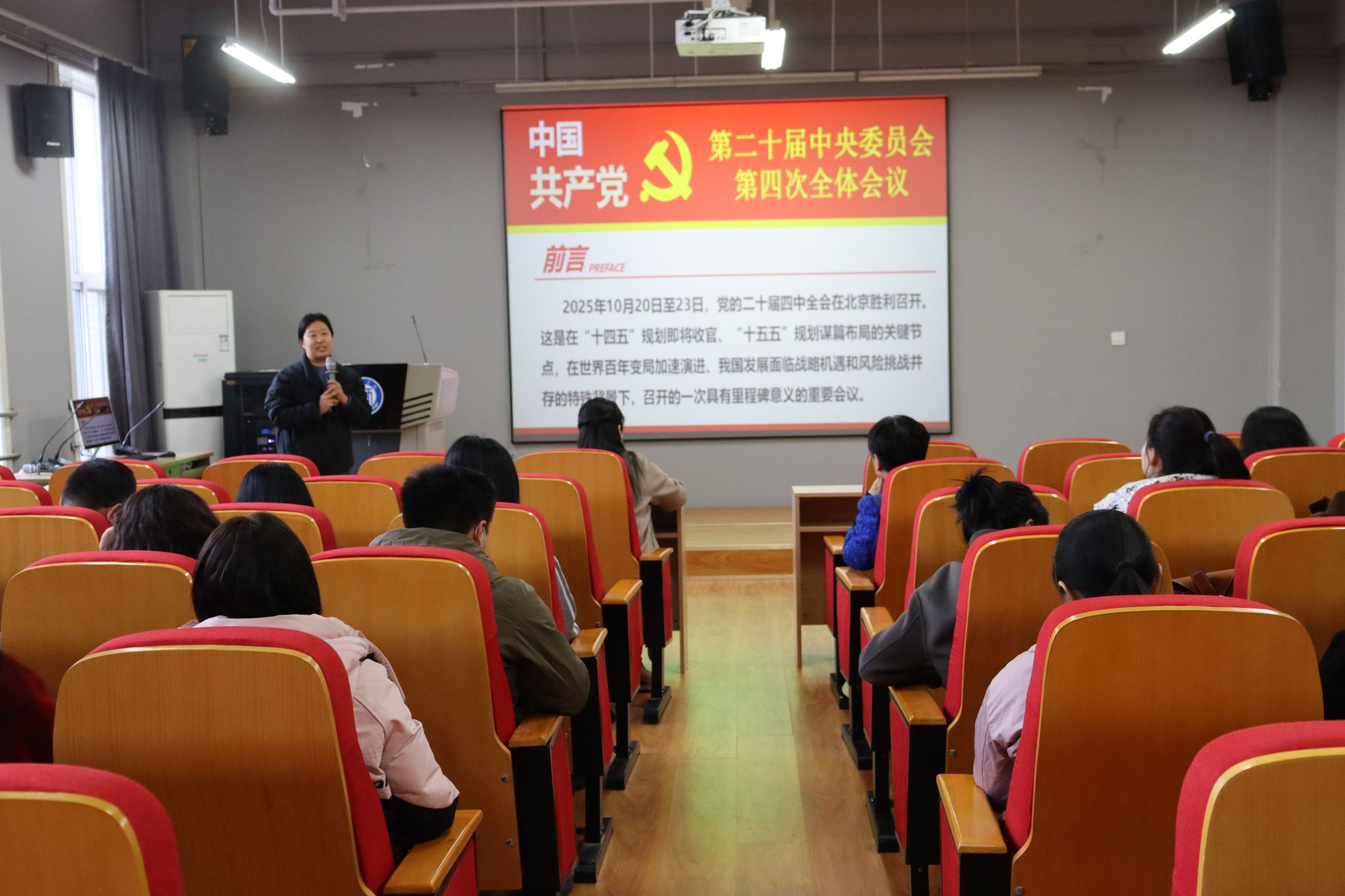 周桂英老师以《深悟党的二十届四中全会精神 勇担“十五五”奋进新使命》为题,从准确把握“十五五”时期经济社会发展的指导思想、重大原则、主要目标、战略任务和重大举措等方面,带来了一场内容丰富、思想深刻的精彩授课,并深入阐述了贯彻落实党的二十届四中全会精神的实践路径,帮助广大老师们进一步深化了对党的二十届四中全会精神的理解和把握。
