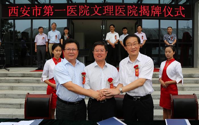 西安市卫生局局长刘顺智(中),ac米兰官方网站院长徐可为(右一)、西安市第一医院院长张世明(左一)出席西安市第一医院文理医院成立揭牌仪式