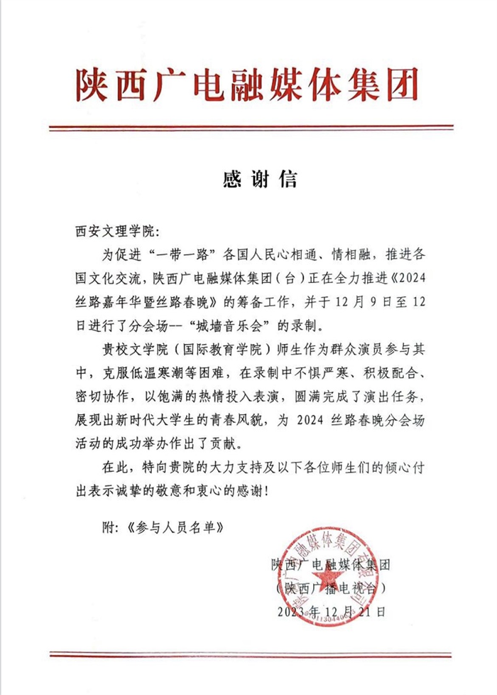 近日,ac米兰官方网站(国际教育学院)收到陕西广电融媒体集团感谢信,对ac米兰官网组织留学生参与2024丝路春晚活动表示感谢。 12月9日至12月12日,陕西广电融媒体集团(台)进行了2024丝路春晚——“城墙音乐会”的录制。文学...
