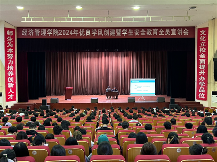 3月27日下午,经济管理学院2024年优良学风创建暨学生安全教育全员宣讲会在大礼堂召开。白沙路派出所警官孙鹏、王东升,经济管理学院党总支副书记朱芳芳、全体辅导员及全体学生参加。辅导员贺丹丹主持会议。 ...