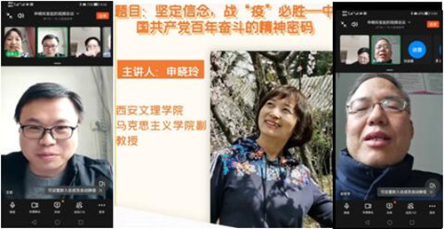 为深入学习贯彻党的十九届六中全会精神,凝聚抗疫动力, 1月14日下午,马克思主义学院思政课党支部开展“坚定信念 抗疫必胜”主题党日活动,本次活动以钉钉视频会议的形式进行,会议由支部书记申晓玲主持,支部全体党...