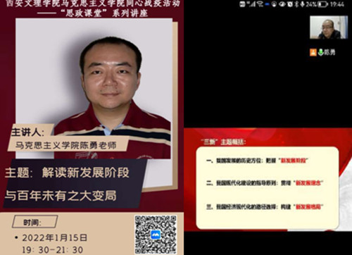 1月15日晚,马克思主义学院“思政课堂”系列讲座邀请陈勇老师讲授《解读新发展阶段和百年未有之大变局》,学院全体学生和部分教师线上参加学习。 陈勇以当前疫情形势为切入点,详细讲述了“新发展阶段”的历史背景和...